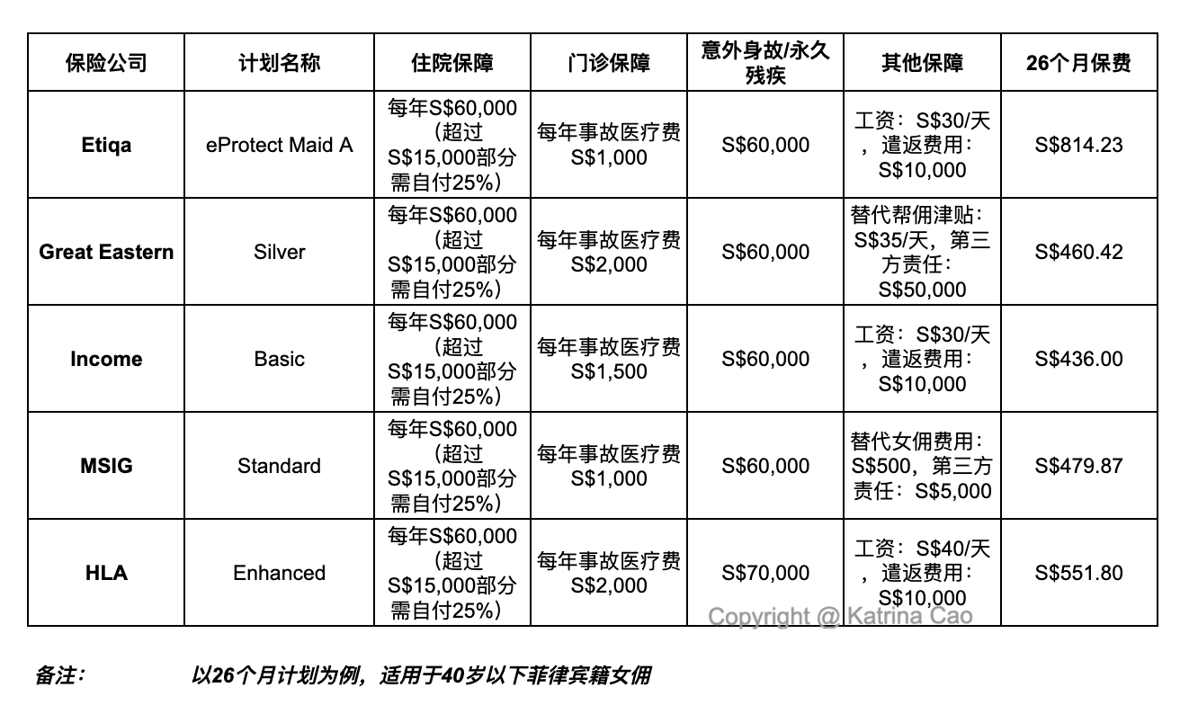 市场上的女佣保险通常满足人力部的最低要求,但附加保障和保费会有所不同。以下是五种保险计划的对比(以26个月计划为例,适用于40岁以下菲律宾籍女佣):