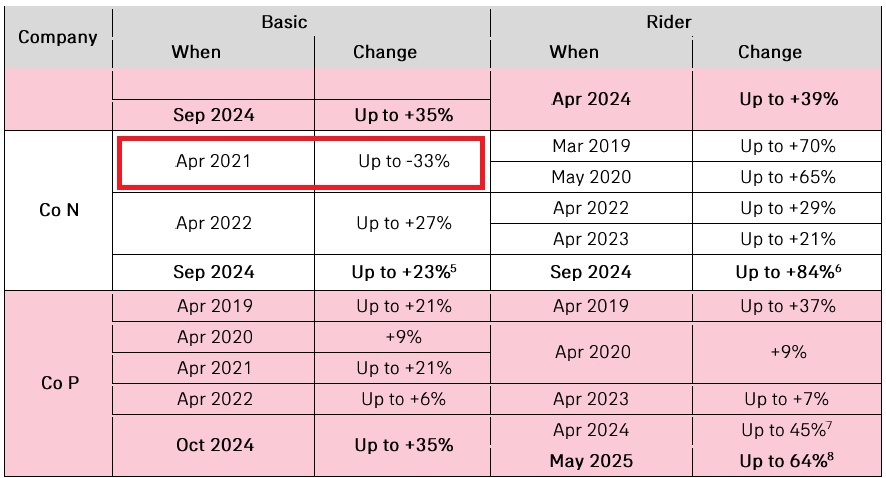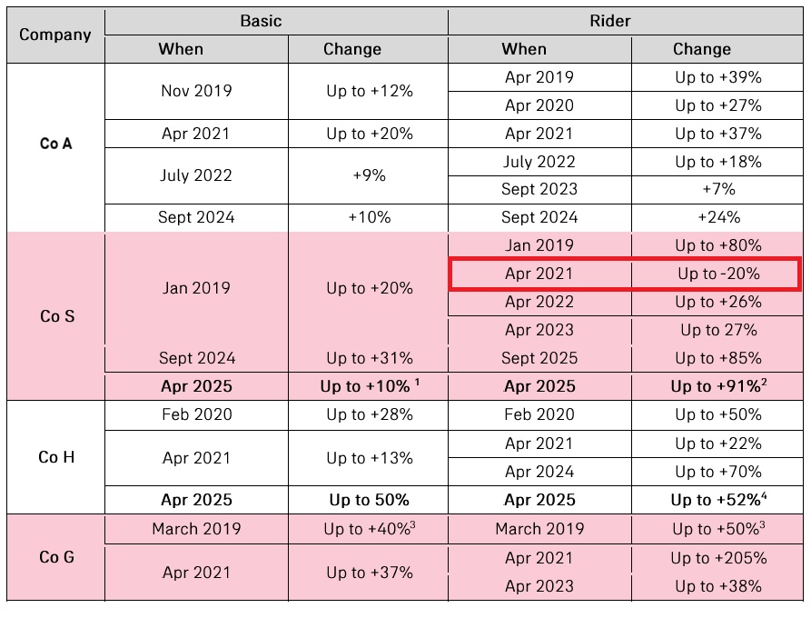 这张表统计了从2019到2025年,市场上绝大多数住院险产品保费的变化情况。其中Basic指的是住院险的主险,rider指的是附加险。