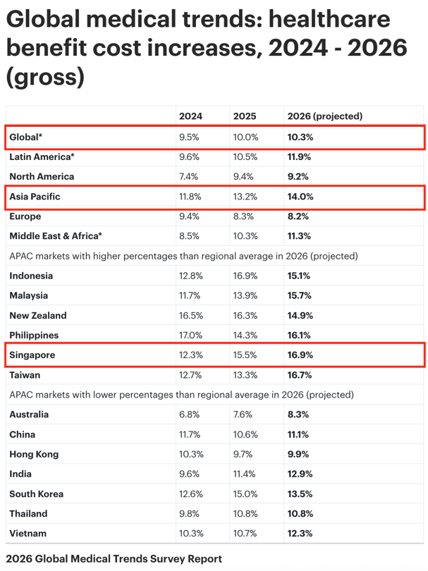 刚才说的只是表面上的原因,更深层的原因是过去这些年医疗费用的飞速增长。根据WTW韦莱韬悦发布的2026年《全球医疗趋势调查》报告,从2024到2026年(2026年为预期),全球医疗成本整体维持在10%以上的涨幅,其中亚太地区的涨幅明显高于全球平均瓶水,新加坡的医疗成本涨幅更进一步高于亚太地区的平均水平。