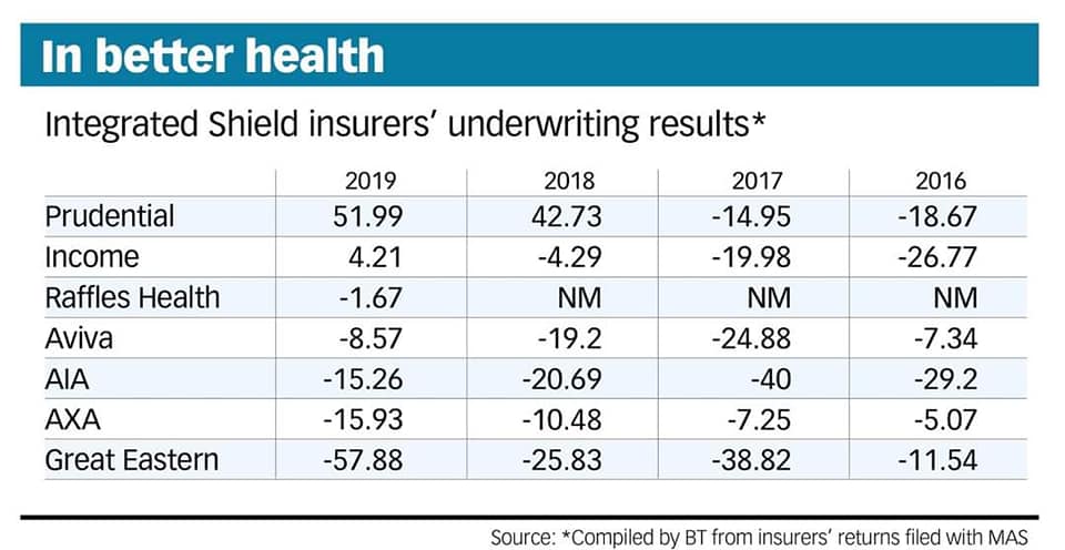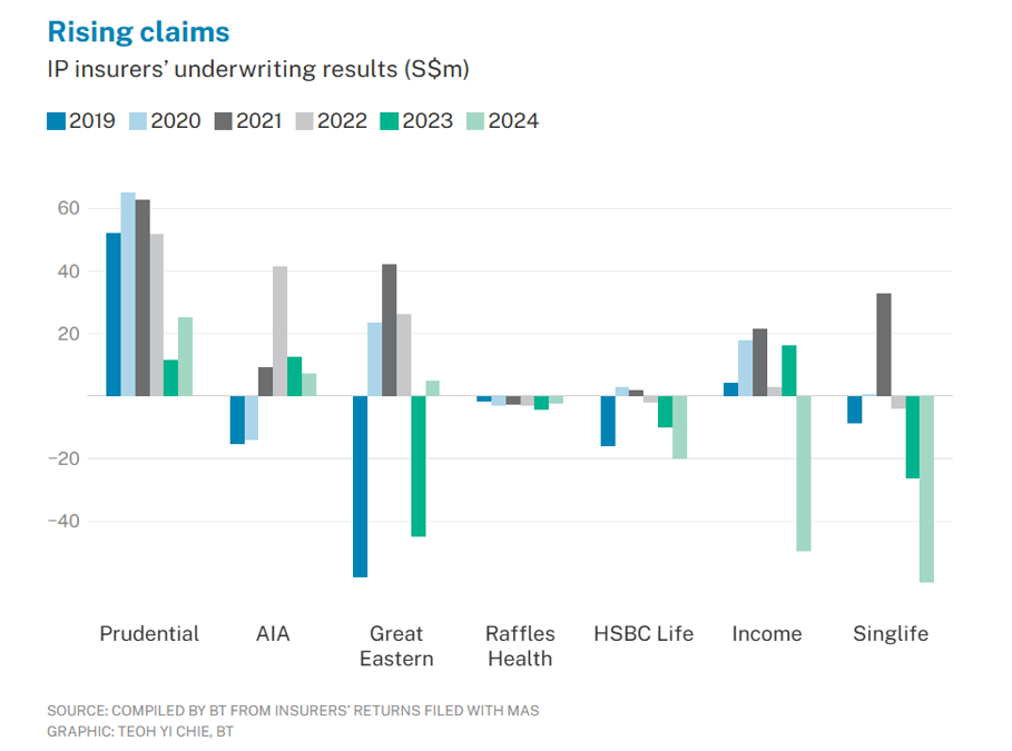 从一个保险从业者的角度来看,保险公司给住院险涨价挺大程度上其实也是无奈之举。我们可以看一下过去几年各家公司在住院险这一项上面的盈亏情况,这里以百万新币为计量单位。