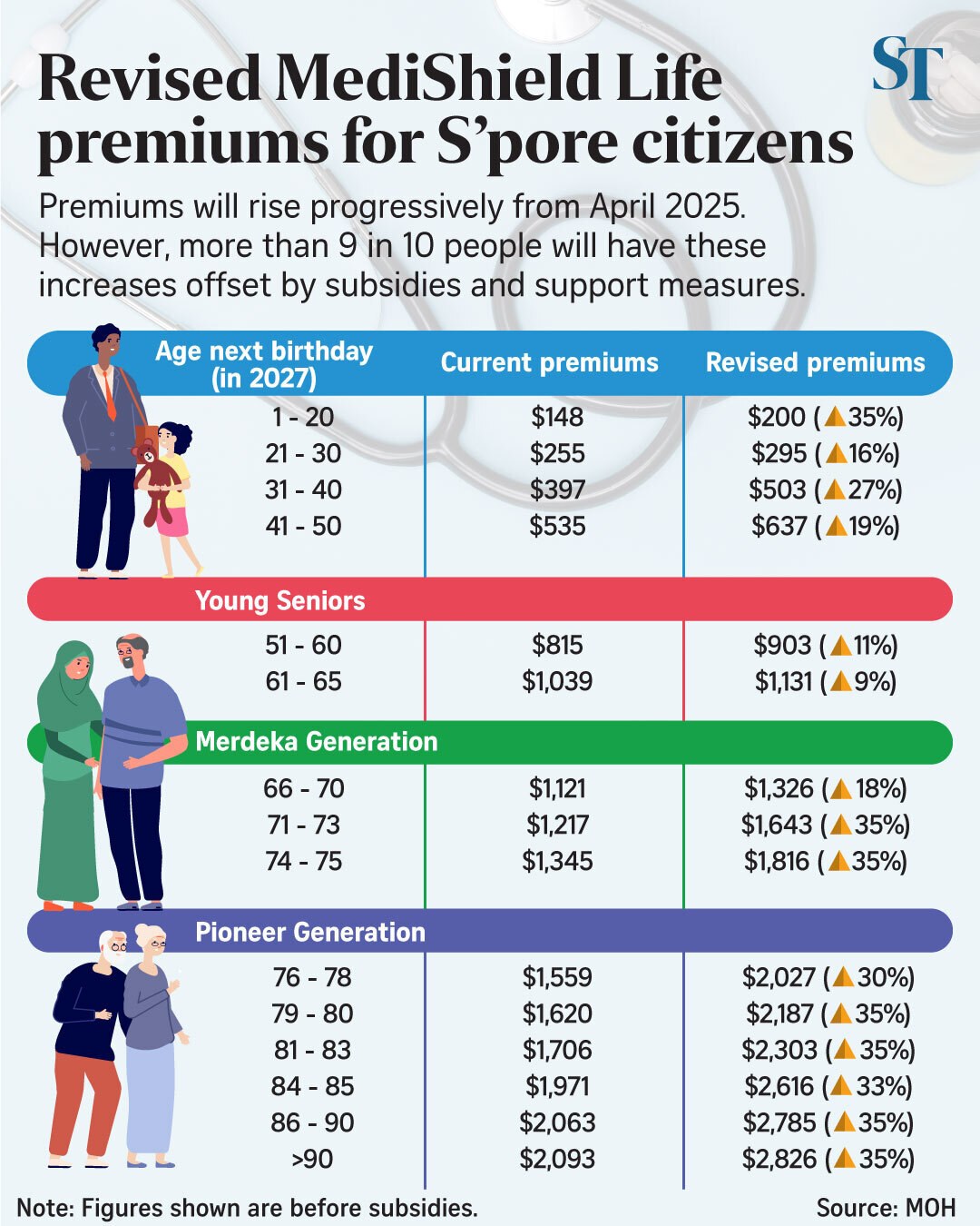 事实上,不仅商业住院险受此影响,政府提供的基础医保同样承受涨价压力。MediShield Life的保费在2021年针对不同年龄层就已经上调了最多35%,2025年起的未来三年会再逐步上调35%。